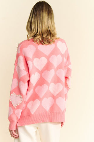 Davi & Dani Heart Pearl Side Slit V Neck Sweater